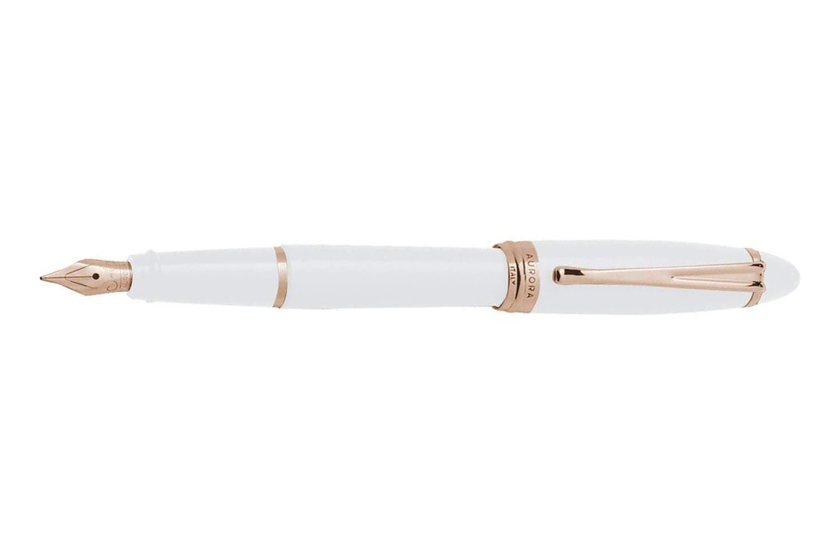 De Aurora Ipsilon vulpen heeft een houder van hars met witte lak en goudgecoate randen. De punt is van roestvrij staal.