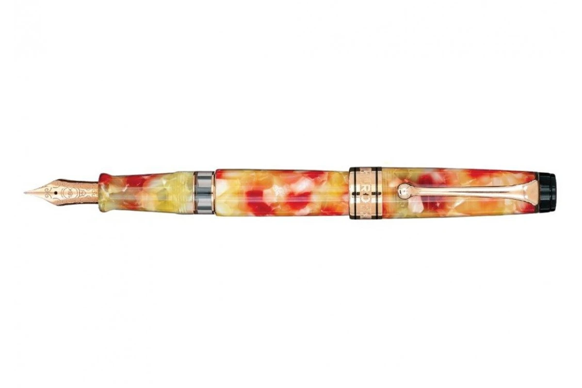 Het oppervlak van de pen is ontworpen in een delicaat gemarmerd auloroidepatroon, uitgevoerd in geel, oranje en rood met rosé gouden accenten. Ook bevat de pen een ink reservoir.
