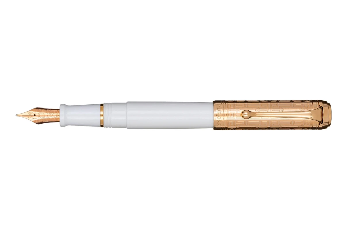The pen’s body is made of white resin, finished with a rose gold cap and the signature Aurora-style clip.