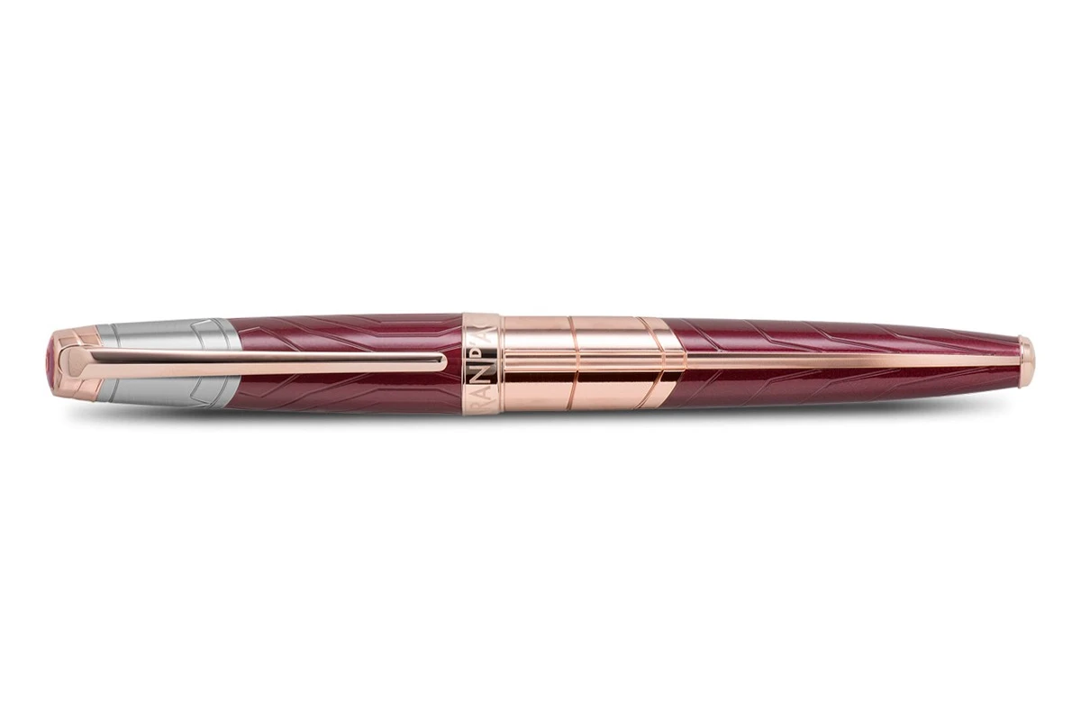 Wat de materiële kenmerken betreft is een ultraprecieze gravure aangebracht op het schrijfinstrument en is het bedekt met een doorschijnende bordeauxrode satijnen lak om de bustier van Wonder Woman weer te geven. De punt van de dop van het schrijfinstrument een ruwe, zilveren afwerking, geïnspireerd door de armbanden van Wonder Woman. De pen is afgewerkt met een 18-karaats massief gouden penpunt, gecoat met roségouden plating voor uitstekende vloeibaarheid.
