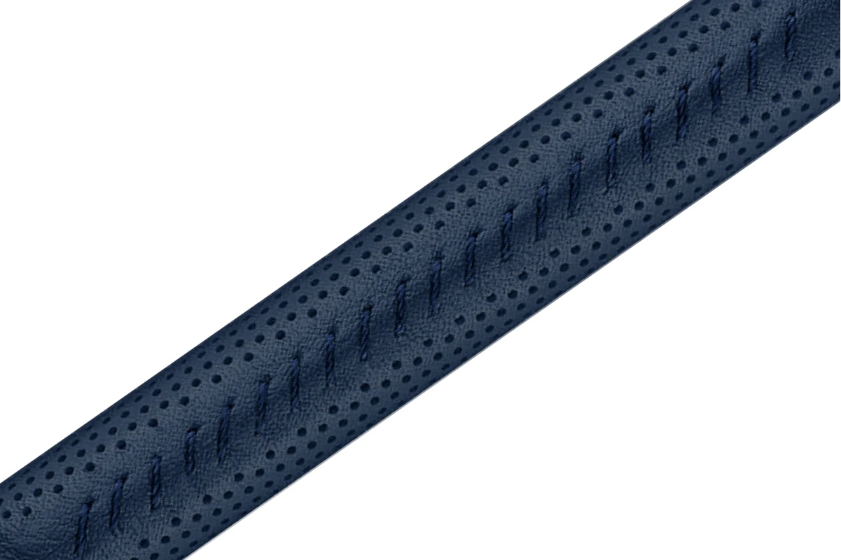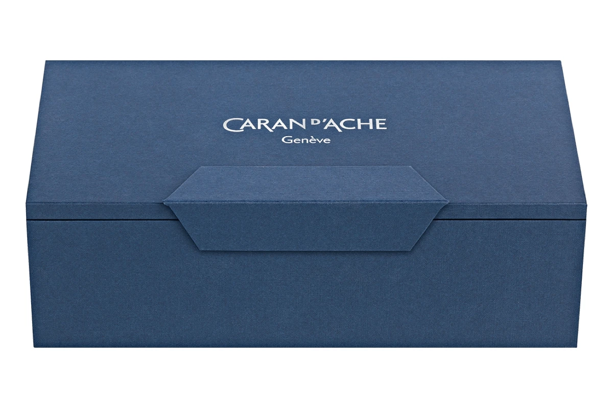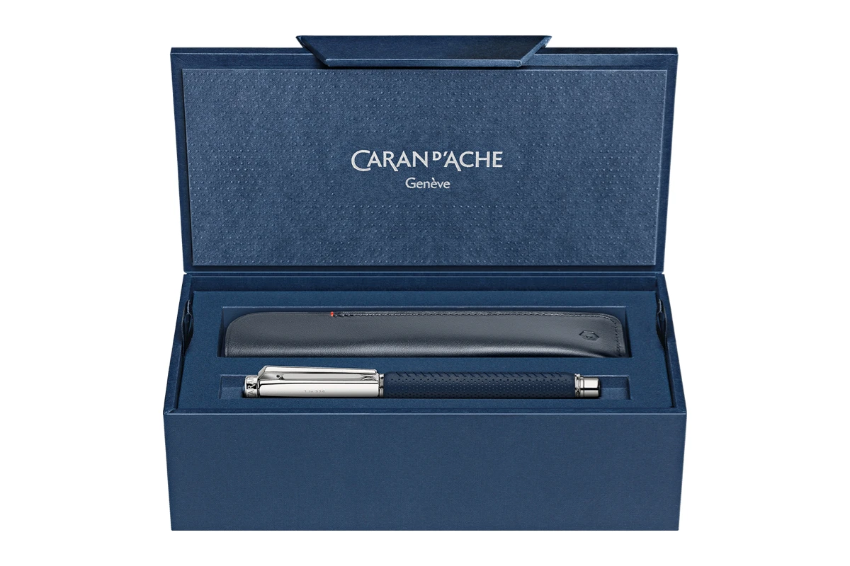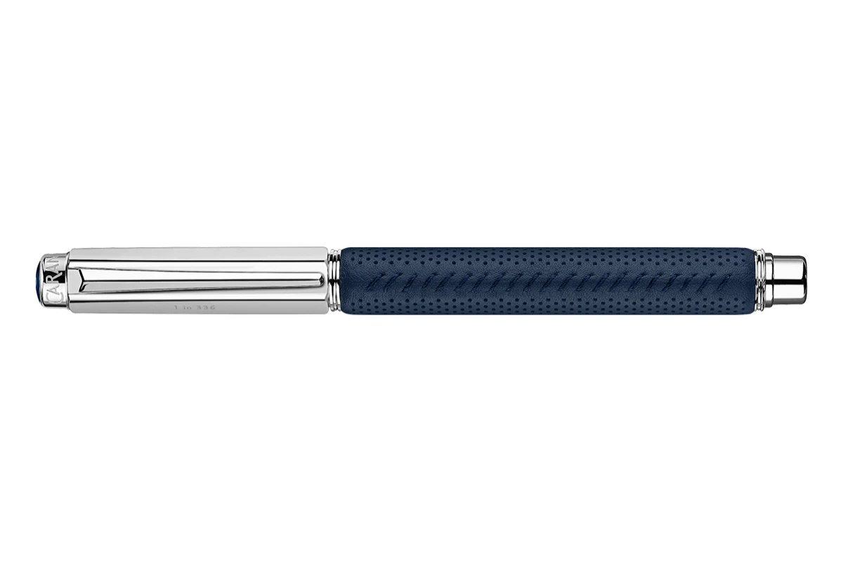 Deze pen heeft een messing lichaam bedekt met zorgvuldig gemaakt geperforeerd nachtblauw leer, versierd met een fijne handgestikte blauwe naad. Het leer ishoogwaardig Europees kalfsleer met minerale looiing uit Italië. De pen heeft een verzilverde gerhodineerde schroefdop met het Caran d’Ache logo gelaserd op de bovenkant.