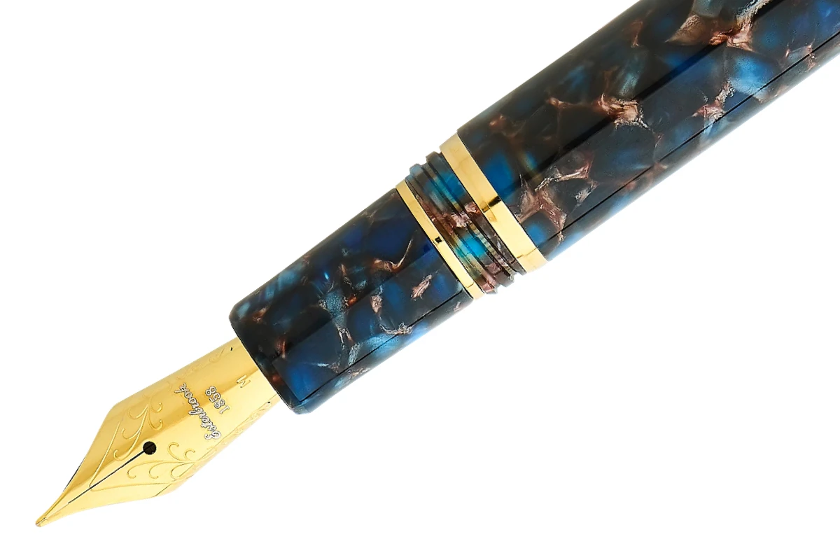 De Esterbrook Estie vulpen in Nouveau Bleu met Palladium trim is gemaakt van prachtig gemarmerd acrylhars in verschillende rijke tinten blauw met een stevige Palladium clip. De clip is speciaal ontworpen om gemakkelijk zonder hulp in of uit een borstzak te schuiven en toch een stevige grip te behouden.