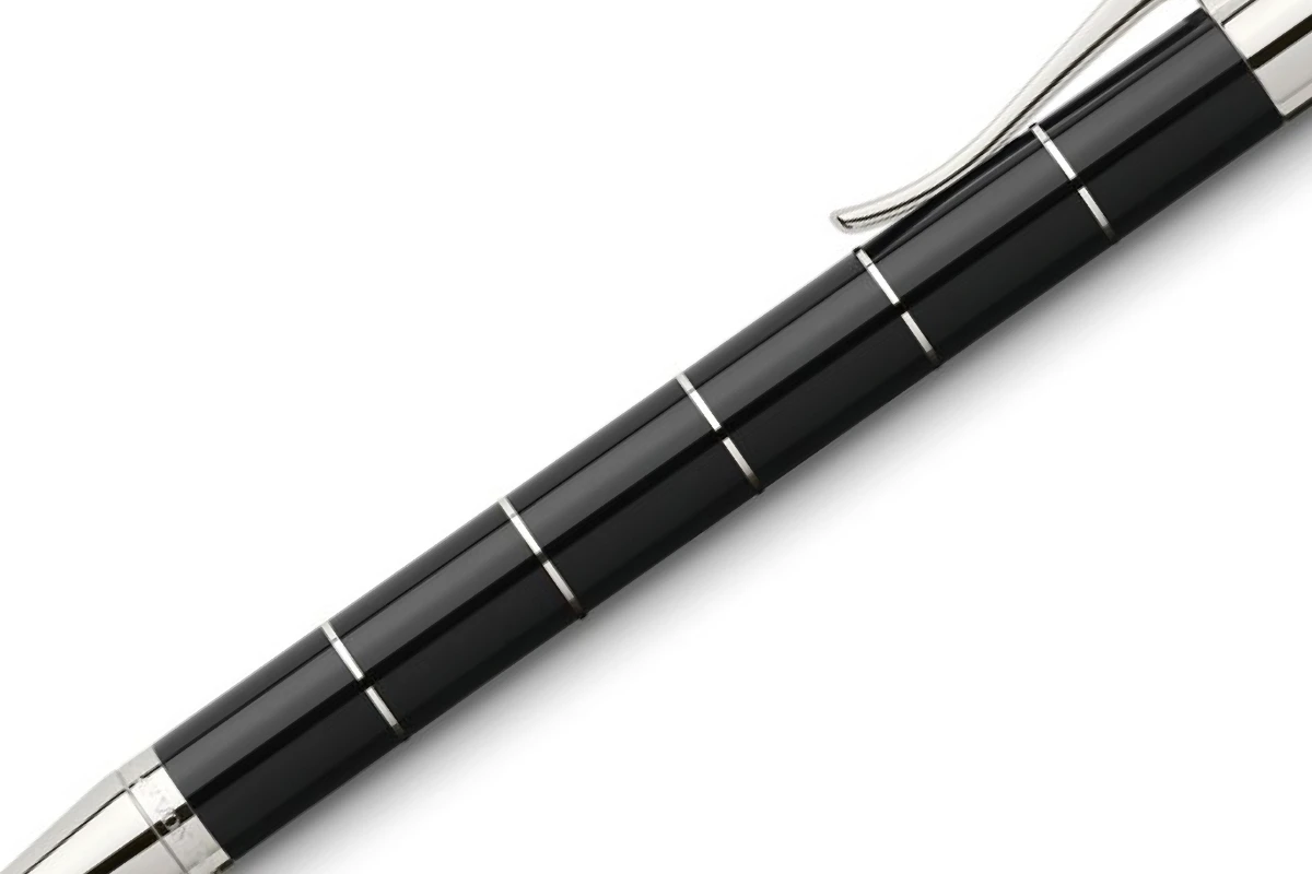 Ringen in verschillende maten, gemaakt van heerlijk contrasterende materialen, zijn de kernelementen van de serie Classic Anello (Italiaans voor “ring”). De loop is gemaakt van verschillende segmenten van Grenadilla-hout of kostbare hars, waartussen fijne, geplatineerde ringen in filigraan detail zijn geplaatst. Contrasterende materialen zijn gecombineerd tot een harmonieus, tijdloos ontwerp dat perfect de naam van deze Graf von Faber-Castell serie weerspiegelt – de ring is immers altijd een symbool geweest van eenheid en eeuwige verbondenheid.