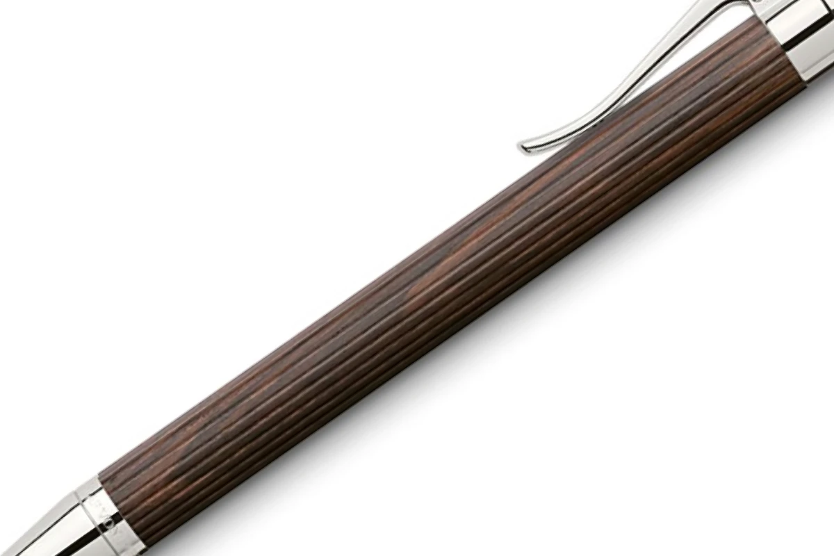 De Classic collectie van Graf von Faber-Castell combineert de natuurlijke uitstraling van hout met de koele elegantie van geplatineerde oppervlaktes. Het lichaam van dit vulpotlood is op verfijnde wijze geribbeld, en uitgevoerd in donkerbruin Grenadilla. Dit type hout is bijzonder hard en duurzaam, waardoor het niet eenvoudig te bewerken is. Dankzij het natuurlijke verschil in textuur en kleur is ieder schrijfinstrument uit deze collectie uniek.