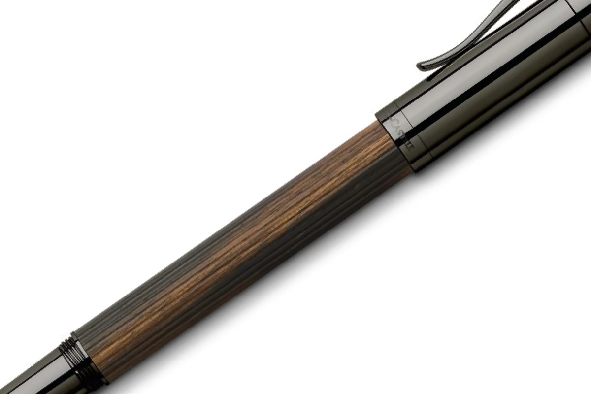 Deze donkere vulpen is afgewerkt met donkere, antraciet-kleurige titanium onderdelen, wat een goede match is bij deze houtsoort. De pen heeft een 18-karaats gouden bicolor penpunt.