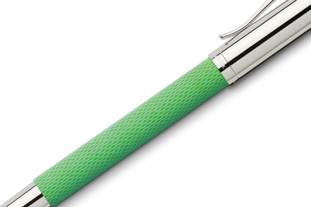 De schrijfwaren uit de Guillochecollectie van Graf von Faber-Castell zijn vervaardigd van rhodium, een kostbaar en bijzonder hard metaal. Het lichaam van deze vulpen is gemaakt van lichtgroen gekleurd hars, waarop een guilloche-gravering (visgraatmotief) is aangebracht. Dit geschiedt volgens een handmatig procédé, dat normaal gesproken alleen bij sieraden en zilveren accessoires wordt toegepast. Hierdoor is ieder schrijfinstrument in de Guillochecollectie uniek.