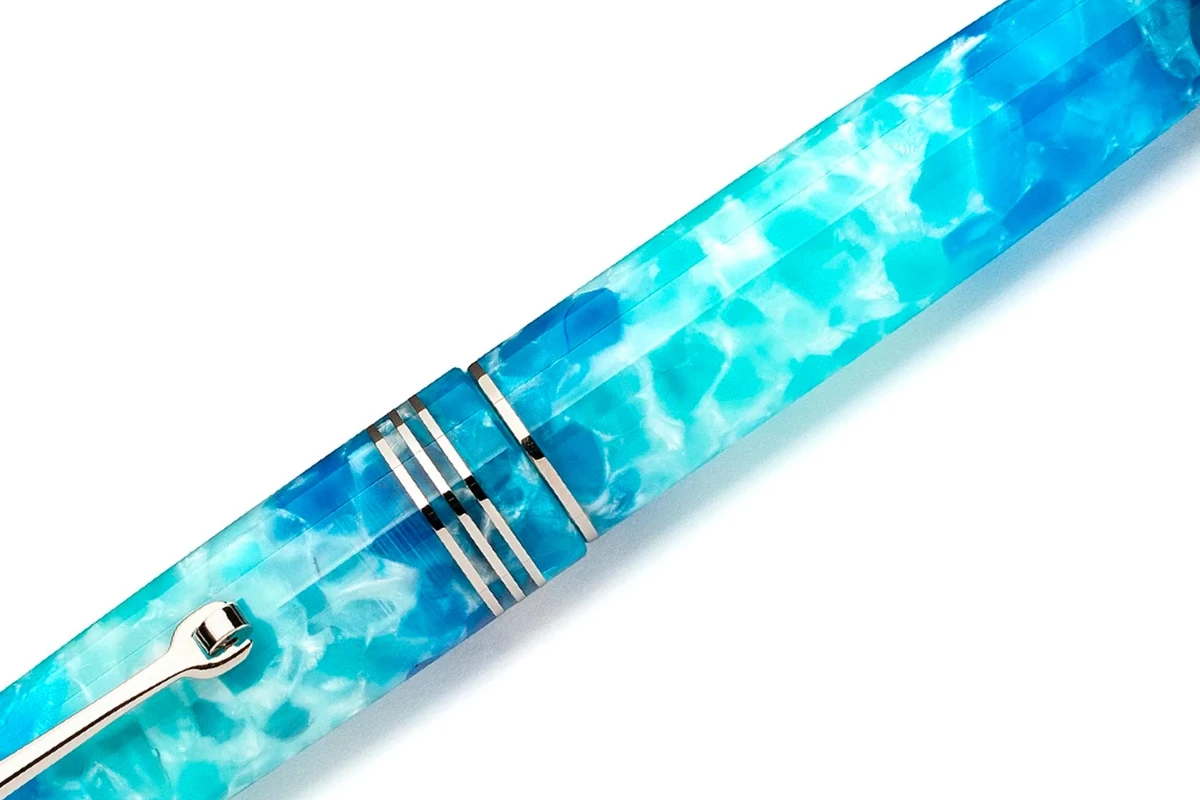 De vulpen heeft een adembenemende harsvulling met levendige kleuren. De sierlijke mix van licht- en donkerblauw creëert een boeiend visueel meesterwerk dat u meeneemt naar een wereld van rustige stranden en de blauwe zee.