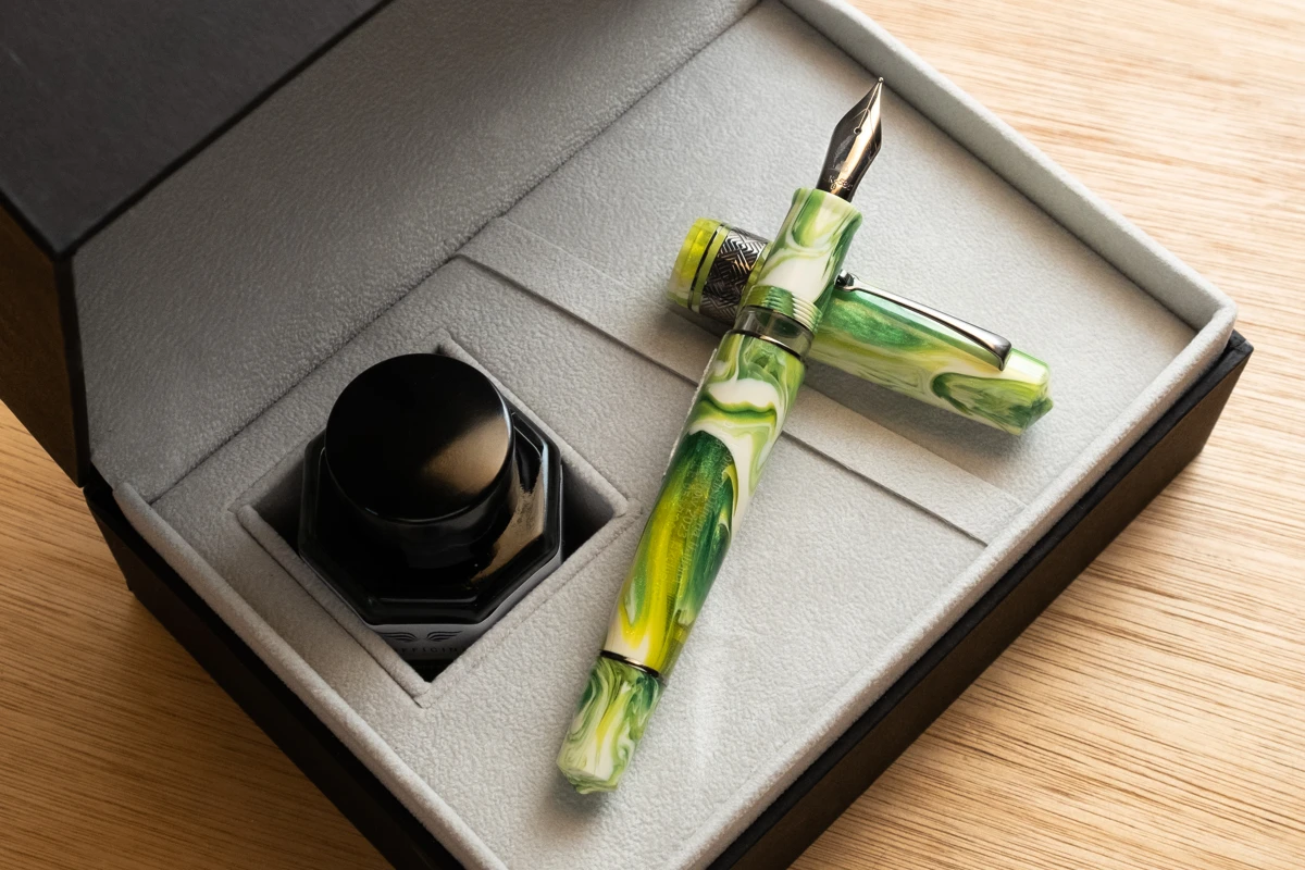 Het materiaal werd vervolgens naar Leonardo gestuurd, waar ze er prachtige pennen van hebben gemaakt. Voor het eerst dit jaar zal de pen verkrijgbaar zijn in 3 verschillende uitvoeringen: goud, zilver en ruthenium.
