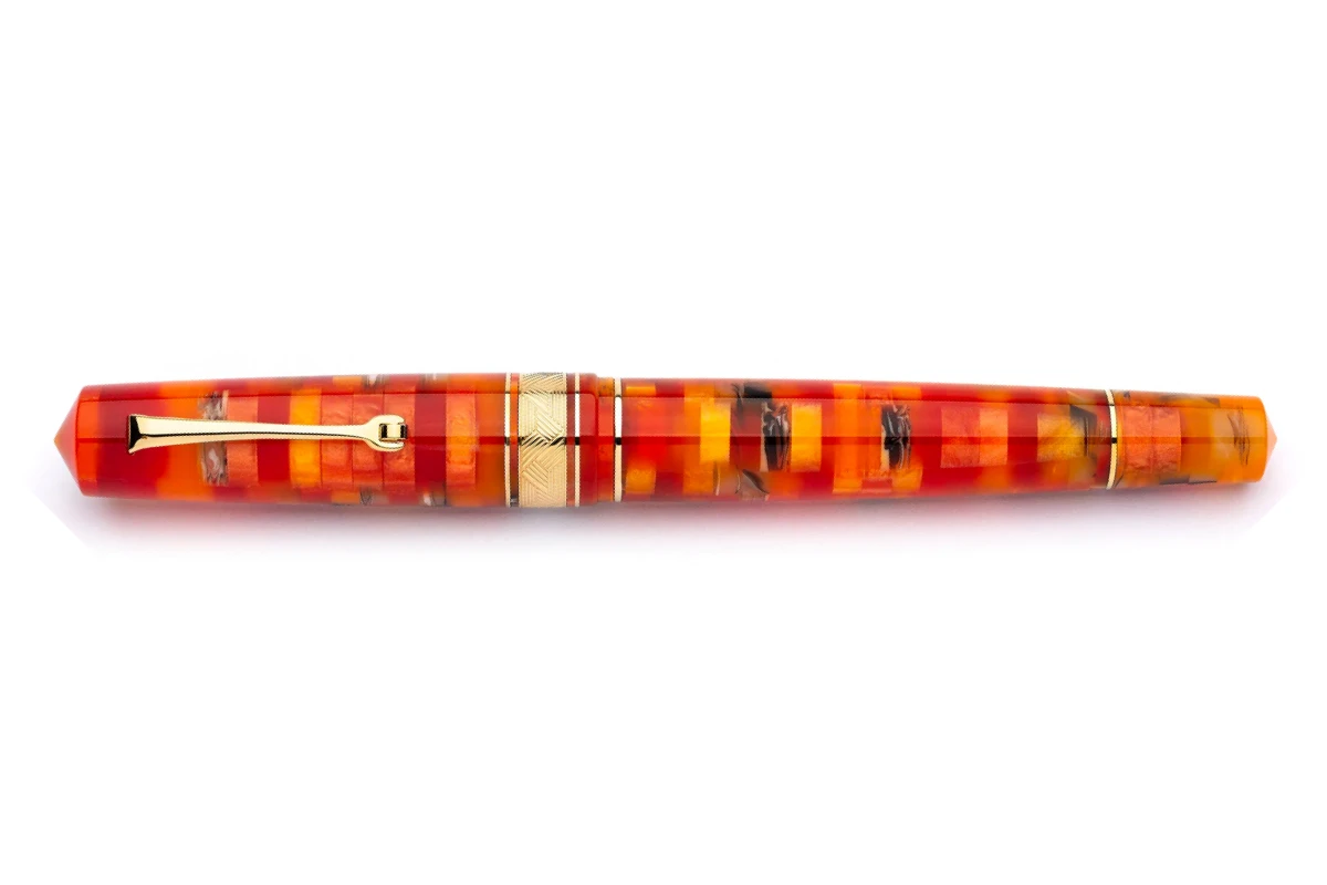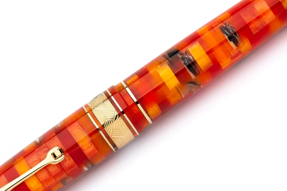 Handgemaakt in Italië door Leonardo Officina Italiana, toont de vulpen een betoverende hars houder die prachtig de essentie van het gelijknamige fruit weergeeft. De levendige tinten van mango oranje, afgewisseld met subtiele tinten van geel en goud, creëren een visueel opvallend ontwerp dat de aandacht opeist. De dop toont trots het iconische Leonardo logo, dat de toewijding van het merk aan uitmuntendheid en fijn vakmanschap symboliseert.