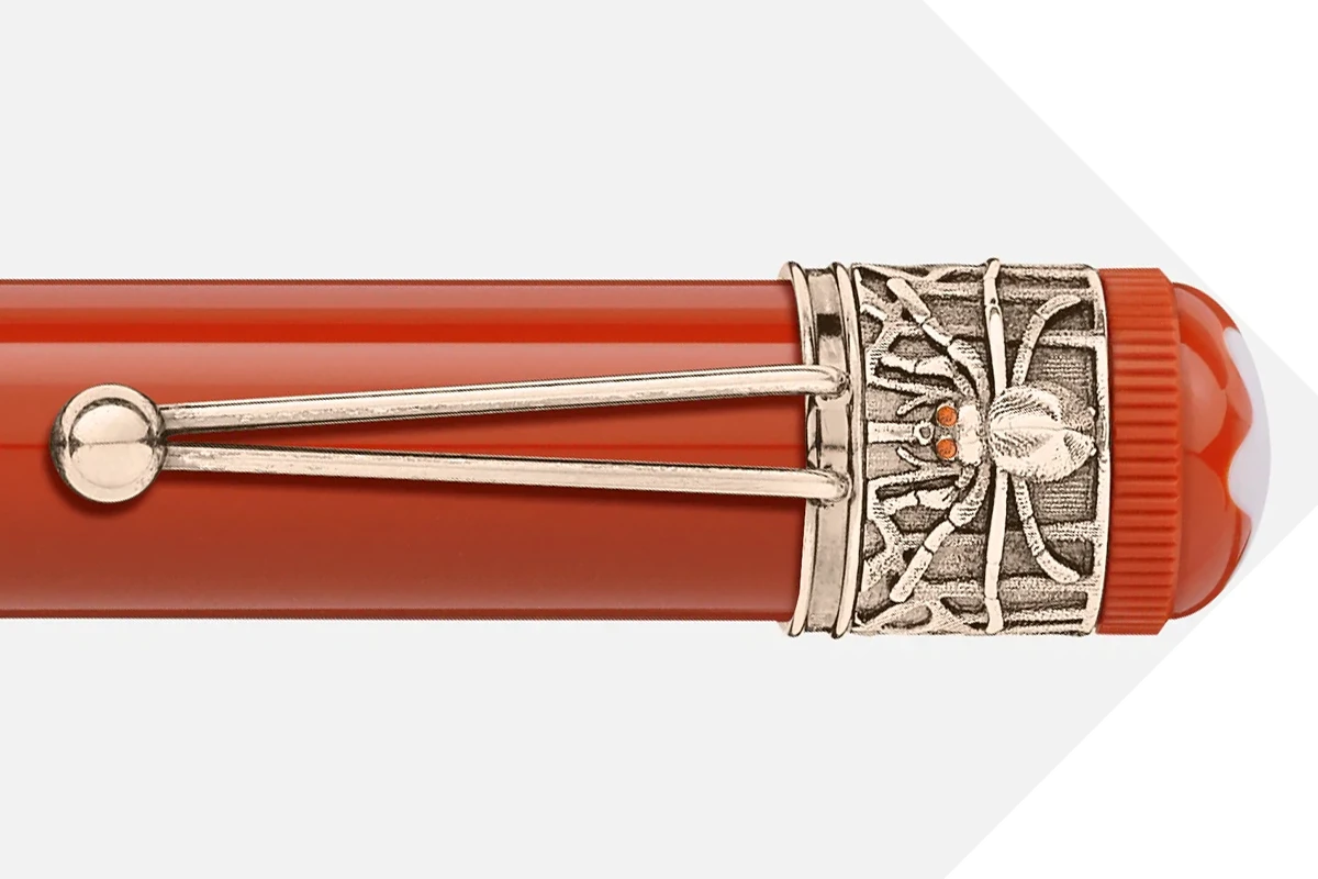 Het lichaam van de pen is vervaardigd van rode hars, en de details zijn verguld (champagne goud). Wat deze balpen zo bijzonder maakt is de vergulde spin – een echte blikvanger.