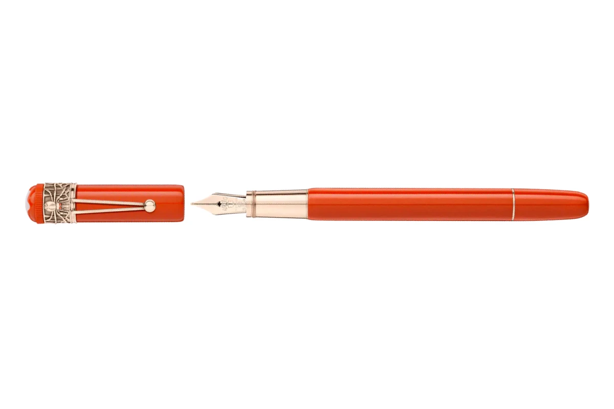 Het rode exemplaar van de Spider Metamorphosis heeft een handgemaakte penpunt van 14-karaats goud, waarop het embleem van Montblanc is gegraveerd. Het lichaam van de pen is vervaardigd van rode hars, en de details zijn verguld (champagne goud). Wat deze vulpen zo bijzonder maakt is de vergulde spin die op de klip is aangebracht – een echte blikvanger.