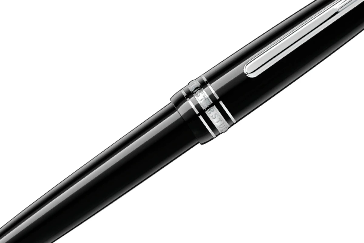 De dop en de houder zijn gemaakt van zwart edelhars met het iconische witte Montblanc embleem in de dop. Dit materiaal behoudt zijn kleur en is bovendien krasbestendig, zodat het schrijfinstrument zijn glans behoudt. De pen is afgewerkt met platina accenten.