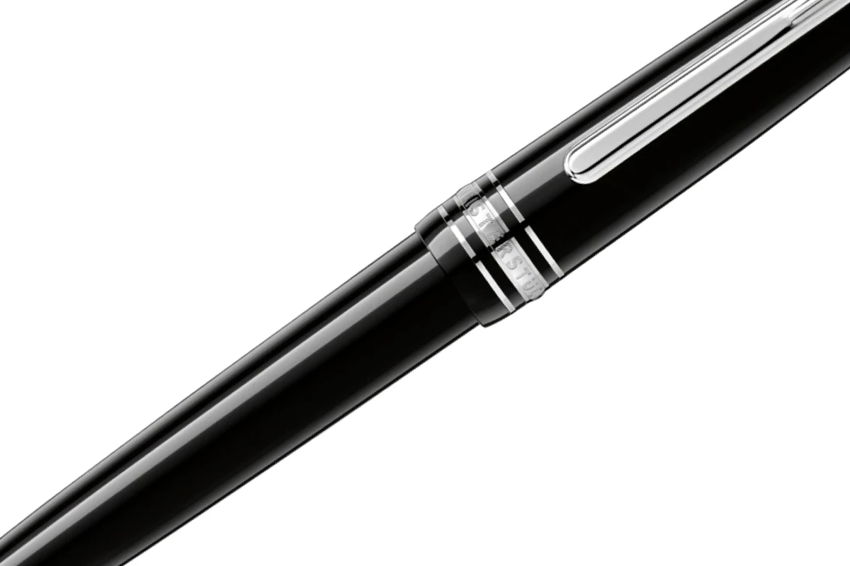 De dop en houder zijn gemaakt van zwart edelhars met het iconische witte Montblanc embleem in de dop. Dit materiaal behoudt zijn kleur en is bovendien krasbestendig, zodat het schrijfinstrument zijn glans behoudt. De pen is afgewerkt met platina accenten.