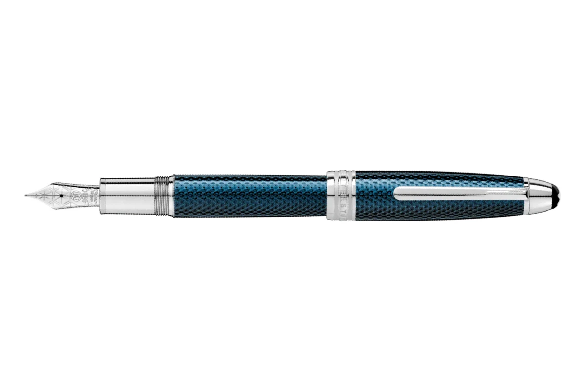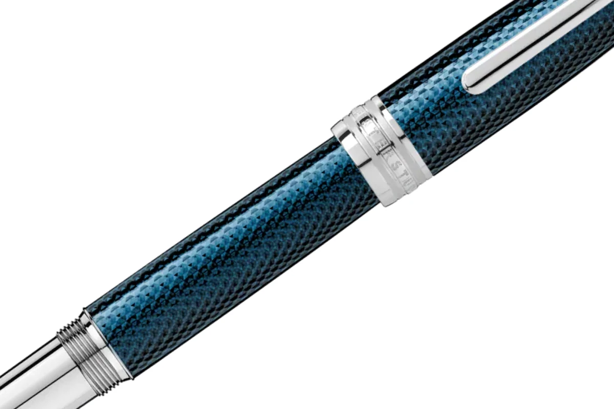 Het zeshoekige patroon op de handgemaakte gerhodineerd gouden penpunt, evenals op de houder en de dop, weerspiegelt de samensmelting van lichten en nachtelijk verkeer in stedelijke steden. Dit is bedekt met doorschijnende diepblauwe lak. De dop wordt bekroond door het iconische witte Montblanc embleem ingelegd en drie ringen met de merknaam Montblanc in reliëf.
