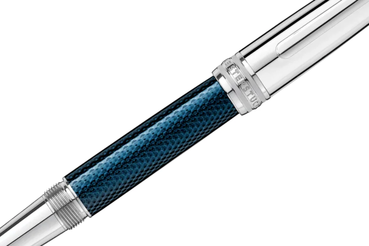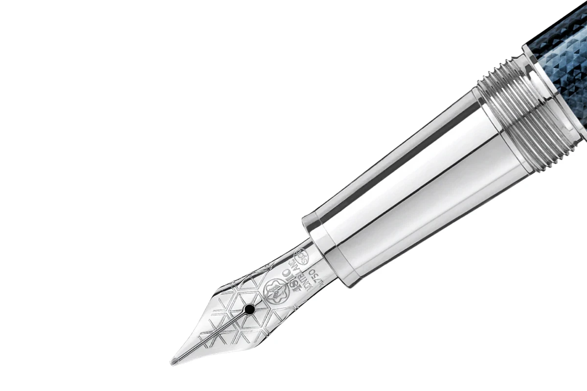 Het zeshoekige patroon op de handgemaakte gerhodineerd gouden penpunt, evenals op de houder en de dop, weerspiegelt de samensmelting van lichten en nachtelijk verkeer in stedelijke steden. Dit is bedekt met doorschijnende diepblauwe lak. De dop wordt bekroond door het iconische witte Montblanc embleem ingelegd en drie ringen met de merknaam Montblanc in reliëf.