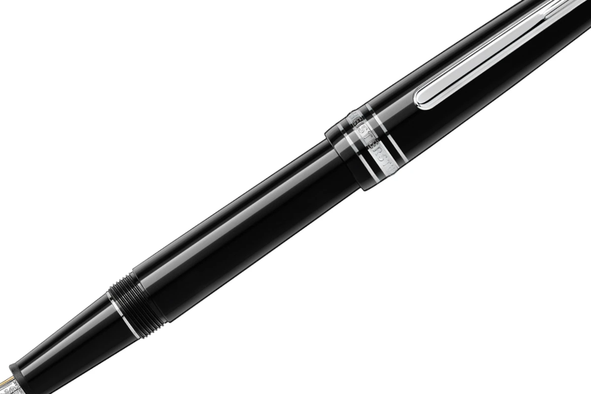 Deze Meisterstück Classique vulpen is gelakt en gemaakt van zwart edelhars, net als de dop van de pen. De gravering in het bovenste stukje van de dop bestaat uit de eerste letter van de 6 meest aangeleerde alfabetten op de wereld, en bevat een klein blauw saffier steentje. De gravering en het saffiersteentje zijn kenmerkend voor de serie pennen die Montblanc heeft uitgebracht voor Unicef. De penpunt is handgemaakt van 14 karaats goud