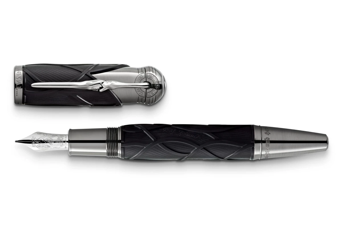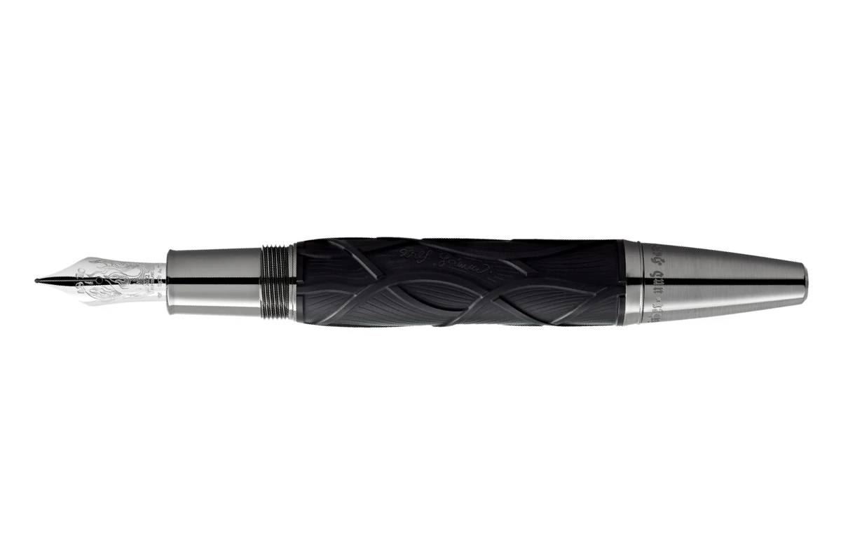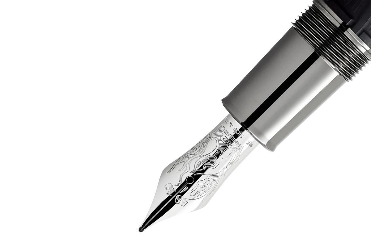 Als een eerbetoon aan de magie van het vertellen van verhalen, is de hangemaakte Au 750 massief gouden penpunt met rhodiumcoating geïllustreerd met vlammen, aangezien deze vaak het decor waren waarrond folkloristische verhalen werden doorgegeven.