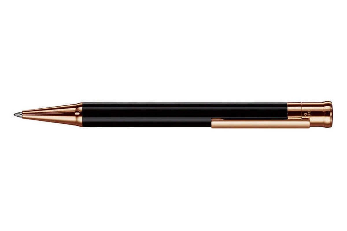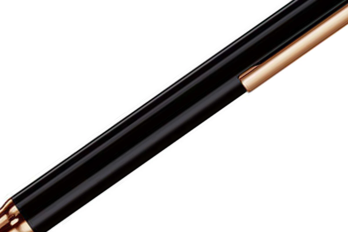 Deze balpen is effen zwart met een lak finish, waardoor deze er erg modern uitziet. De pen heeft een roségouden clip en ook de afwerkingen zijn roségoud.