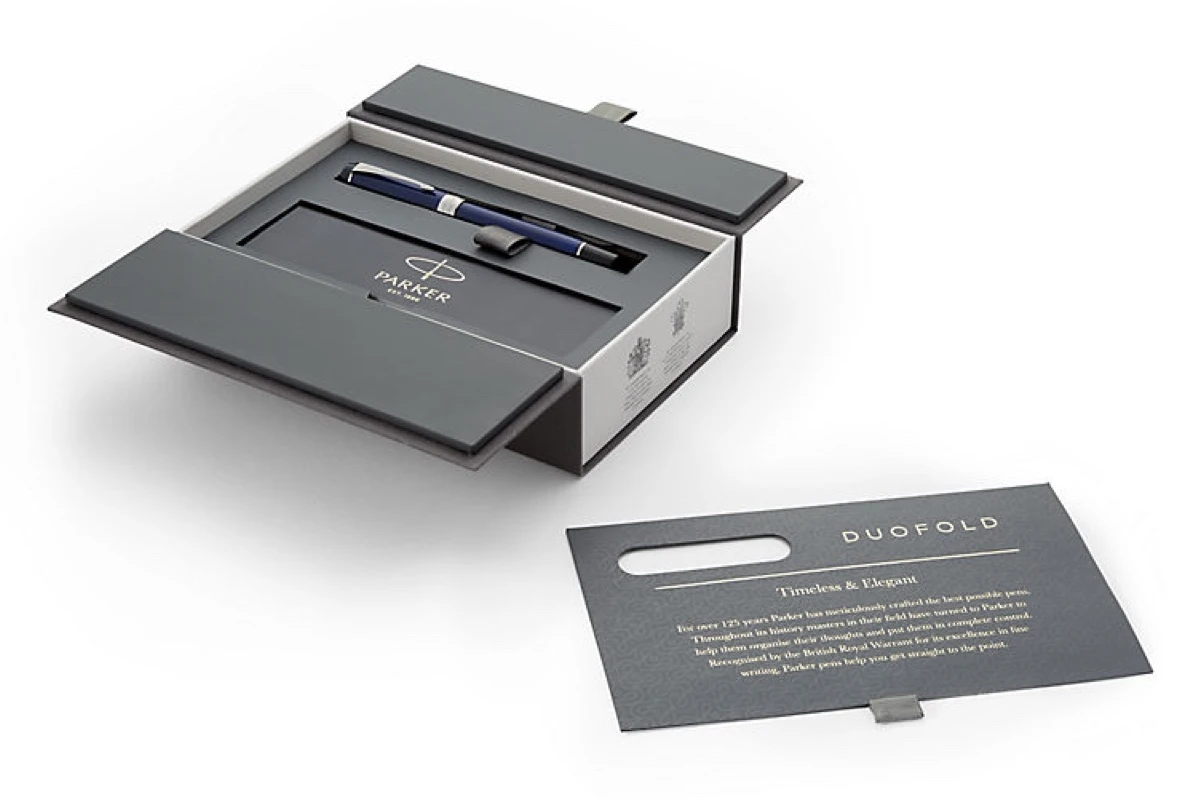 Wordt verpakt in een luxieuze Parker cadeaudoos.