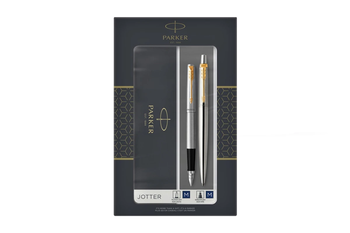 Deze duo set bevat een Jotter balpen en vulpen van roestvrijstaal.