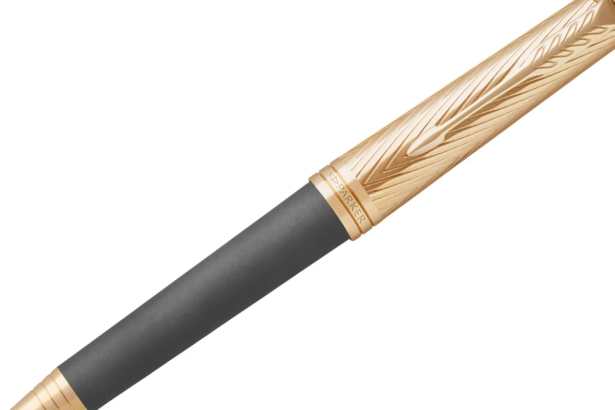 De Parker Premier heeft een licht goude laag over de pen en een geherinterpreteerd iconisch geslepen patroon.