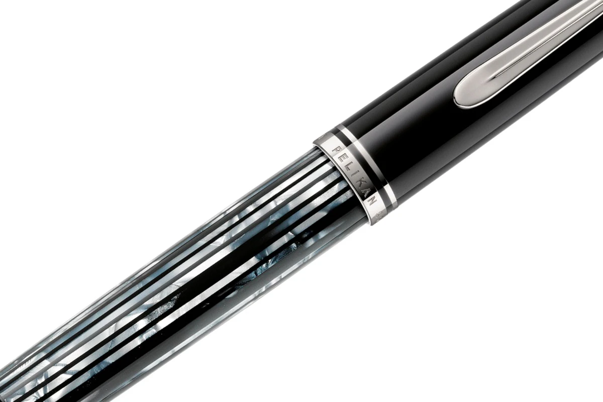 De markante schrijfinstrumenten krijgen extra glans door de typische dubbele ringen en de voor Pelikan karakteristieke snavelclip. De vulpen heeft een 14-karaats gouden penpunt, die volledig gerhodineerd is, waardoor deze een zilveren uitsraling bekomt. De penpunt zorgt voor een bijzonder aangename en zachte schrijfervaring. De zuigervulpen is optioneel verkrijgbaar in de penbreedtes EF, F, M of B.