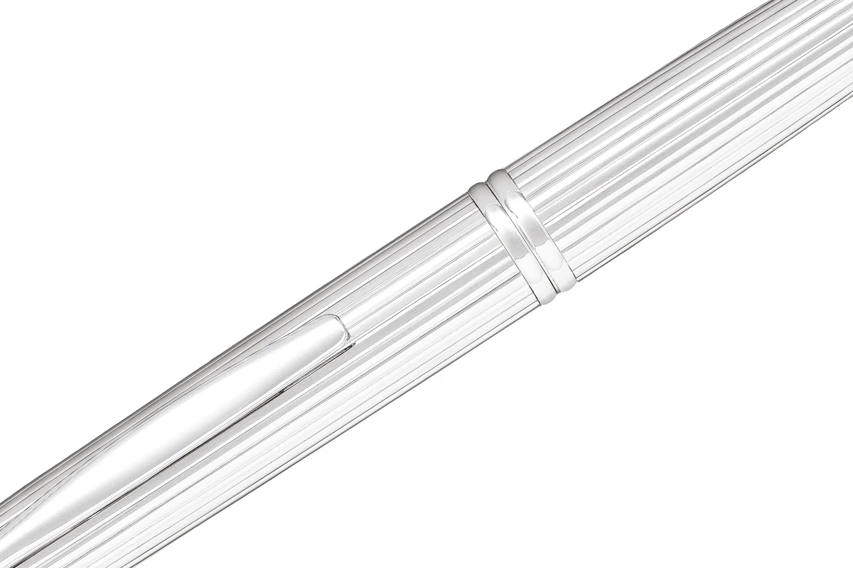 De pen beschikt over een zilver lichaam met ingegraveerd strepen patroon voor een strakke moderne look.