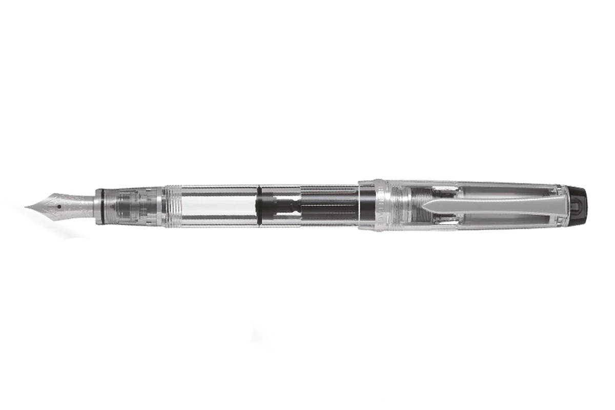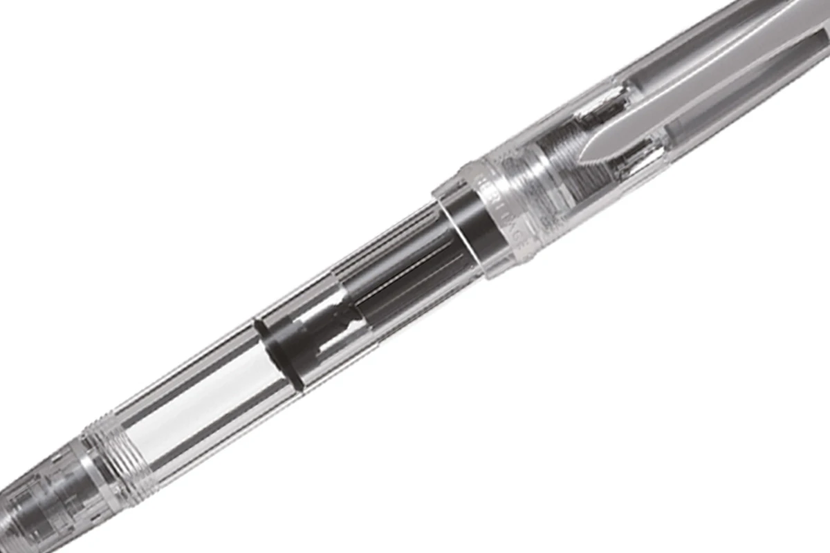 De pen is gemaakt van kleurloos transparant hars met een platte topvorm. De transparante houder onthult het mechanisme van de zuiger, met name de spoel en de zwarte stop die de inkt volledig luchtdicht afsluit.