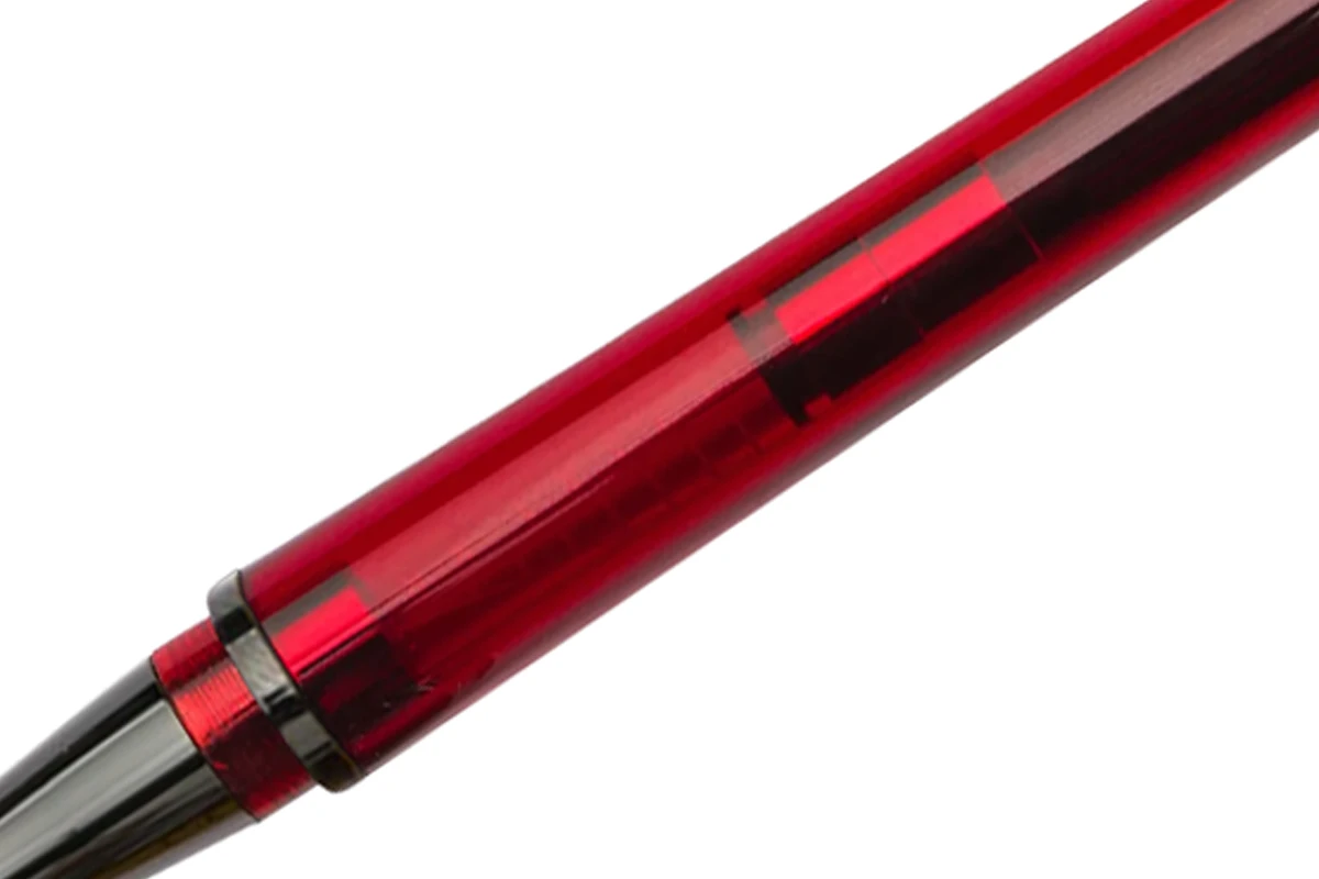 Deze pen heeft een transparant rood lichaam waarin het niveau van de inkt te zien is.