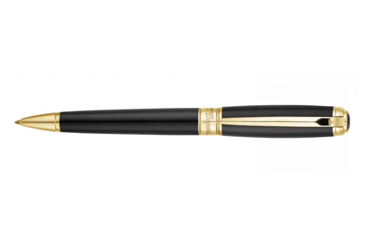 Dit schrijfinstrument van de Line D collectie van S.T. Dupont is vervaardigd uit zwarte lak. De afwerkingen en de clip zijn van goud. De Line D wordt gekenmerkt door een duidelijk herkenbaar merk, zoals de handtekening op de clip en de D van Dupont op de dop.