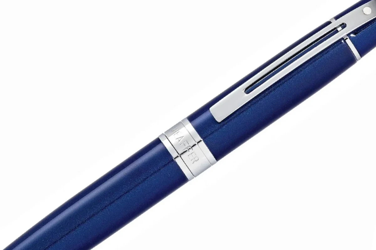 De balpen is gemaakt van glimmende blauwe lak met gepolijste chromen afwerkingen.