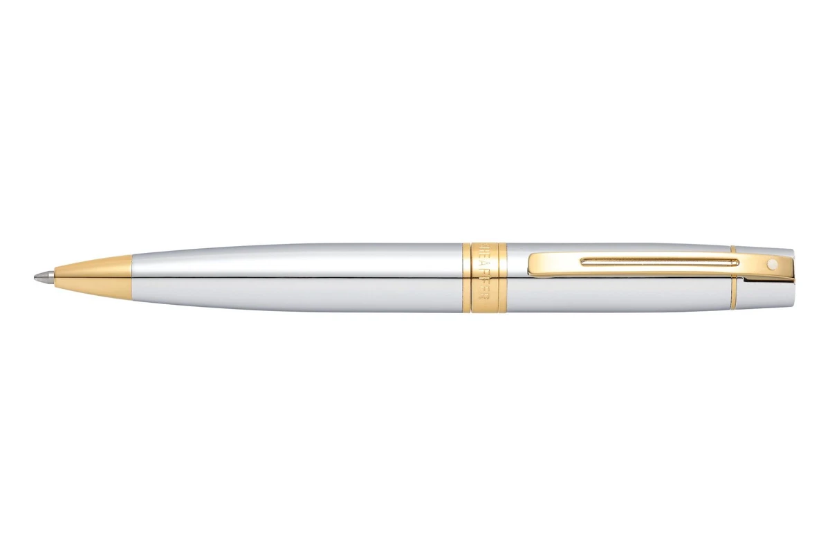 De balpen is gemaakt van helder chrome en afgewerkt met gepolijste goudkleurige details.