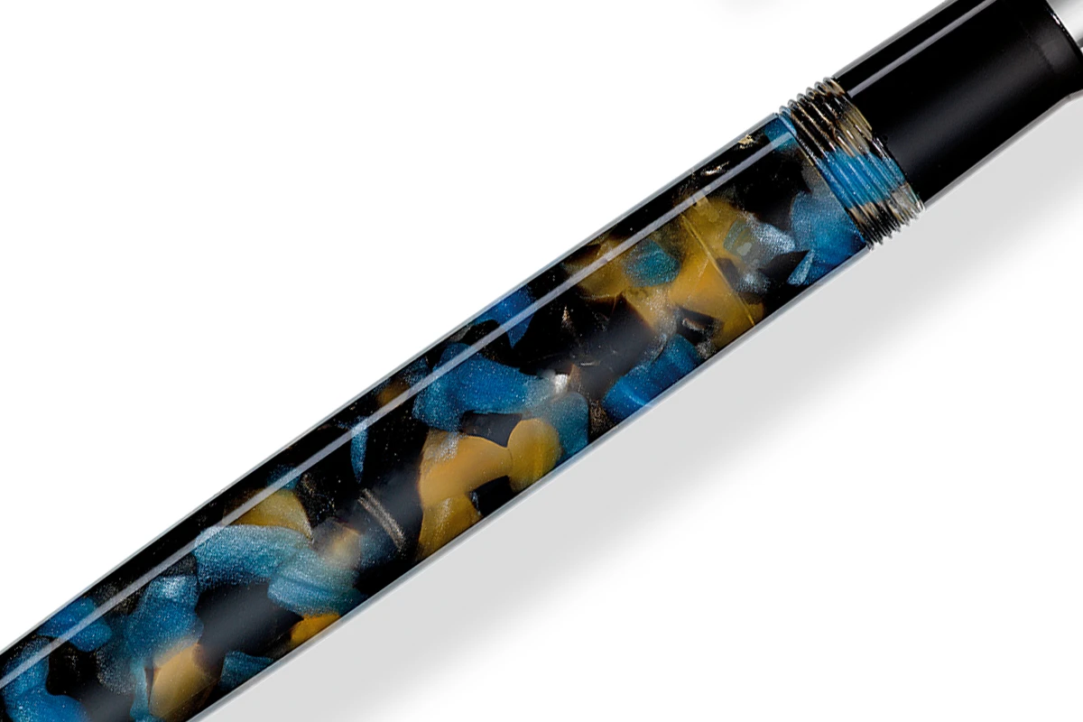 Dit schrijfinstrument is de N.60 van Tibaldi. Tibaldi maakt onderdeel uit van Montegrappa. Tibaldi dateert uit 1916 en is daarmee de oudste penfabrikant van Italië. Inmiddels creëeren ze ook moderne schrijfinstrumenten, zoals deze vulpen vervaardigd uit blauwe en zwarte hars. De afwerkingen zijn van palladium.