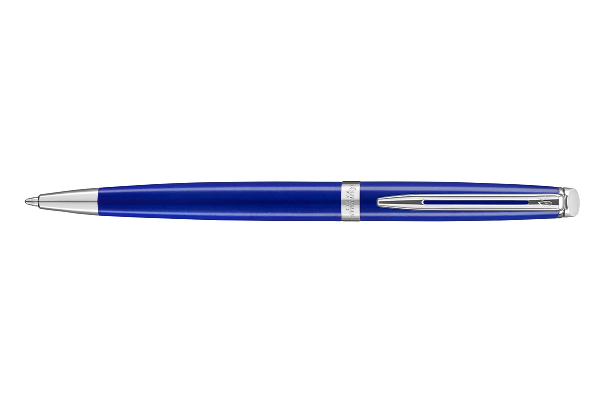 Deze balpen is afgewerkt met een heldere blauwe lak en verchroomde details. Ook verkrijgbaar als vulpen en rollerball.