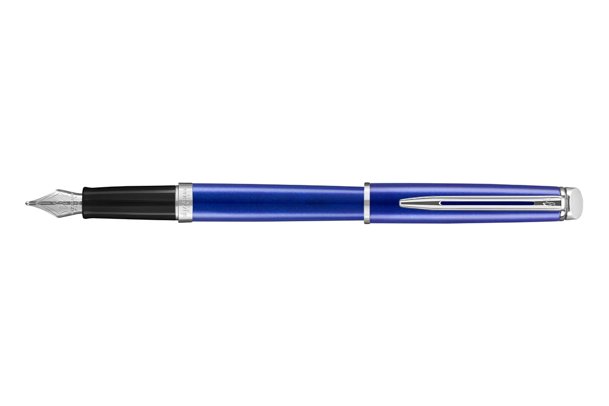 Deze vulpen is afgewerkt met een heldere blauwe lak en verchroomde details. Ook verkrijgbaar als balpen en rollerball.